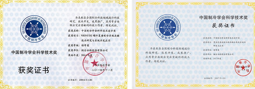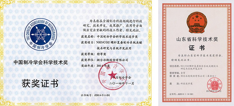 “NH3/CO2螺杆复叠制冷系统关键技术研究与系统开发应用”获山东省科技进步一等奖和中国制冷学会科技进步特等奖。