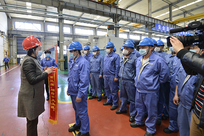4月22日上午,烟台市人大常委会党组副书记、副主任、市总工会主席刘洪波,市总工会党组成员王文仁率市总工会相关部门负责人亲临烟台j9九游会压缩机有限公司,为我公司“烟台市首席技师”、全国机械工业行业劳动模范姚海锦披上红色绶带,并颁发第三届“烟台十大工匠”荣誉证书、工匠奖牌。