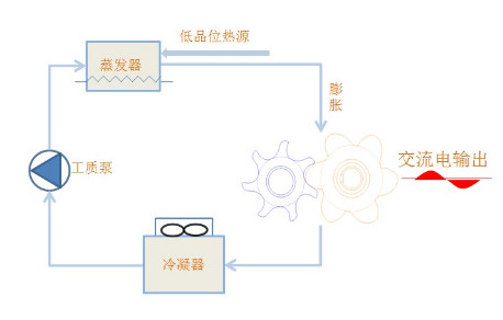 基于有机郎肯循环(Organic Rankine Cycle简称ORC)原理,利用低品位热源产生动力:通过低沸点有机工质获取其他介质的热能,转化为压力能,通过膨胀机将压力能转化为机械能,最终通过发电机将机械能转化为电能。